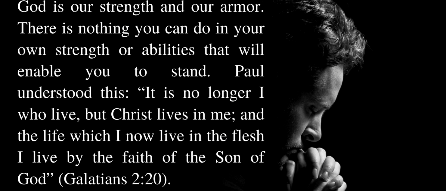 God is our strength and our armor. There is nothing you can do in your own strength or abilities that will enable you to stand. Paul understood this: “It is no longer I who live, but Christ lives in me; and the life which I now live in the flesh I live by the faith of the Son of God” (Galatians 2:20). He lived by the attributes of God. It was literally the life of Christ in him that was his life force.
